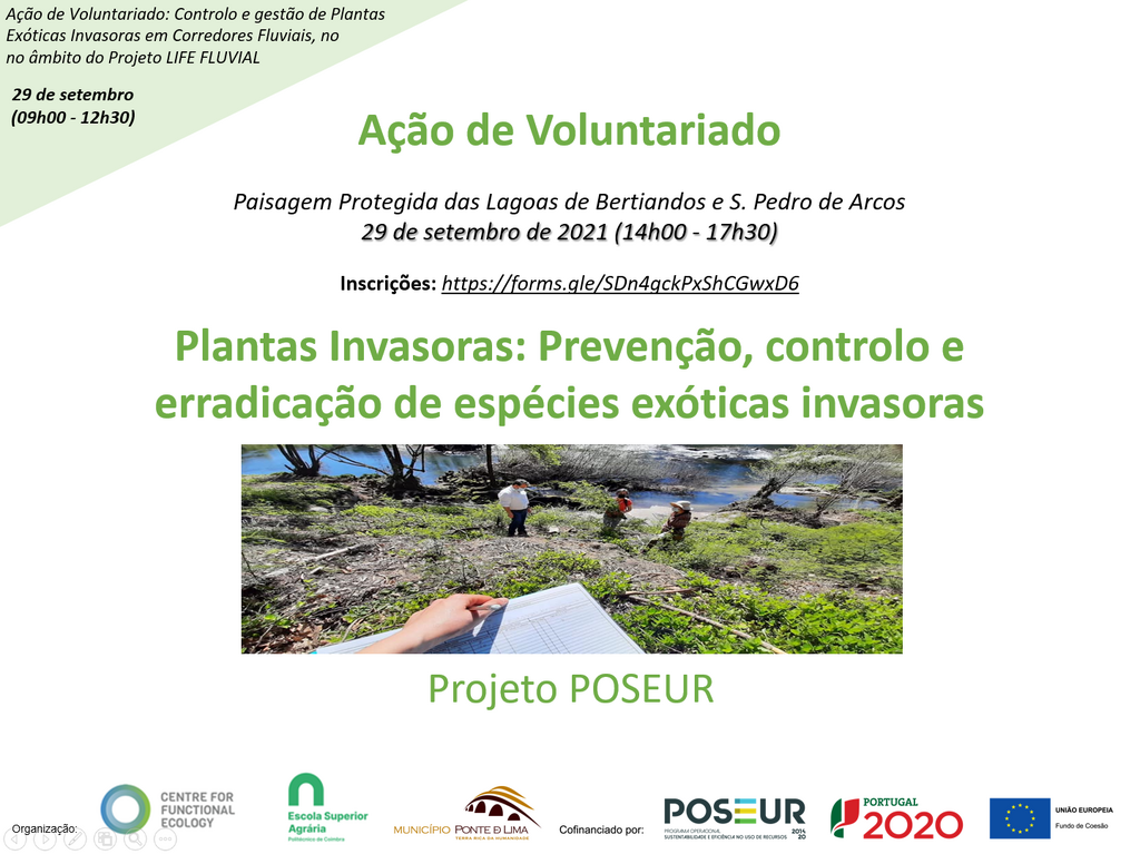 No próximo dia 29 de setembro, entre as 14h00 e as 17h30, irá decorrer uma ação de voluntariado sobre Controlo de Plantas Invasoras no âmbito do Projeto POSEUR - "Prevenção, controlo e erradicação de espécies exóticas invasoras” no âmbito do projeto POSEUR. Uma colaboração entre o Município de Ponte de Lima, a Escola Superior Agrária do Instituto Politécnico de Coimbra, o Centro de Ecologia Funcional/Universidade de Coimbra, a Escola Superior Agrária de Coimbra (ESAC - IPC), e o Centre for Functional Ecology - Science for People & the Planet Universidade de Coimbra.