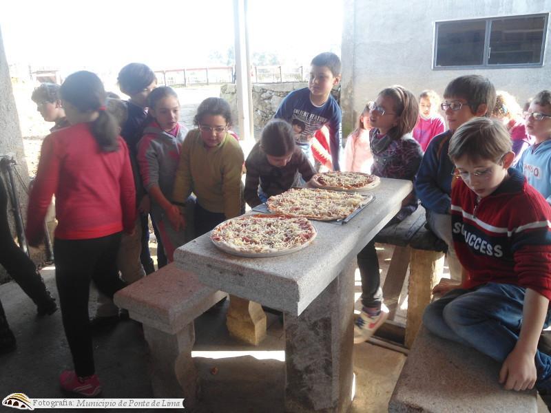 Assim, os alunos deslocaram-se à Quinta de Pentieiros e, na Cozinha dos Viveiros, meteram literalmente a "mão na massa": depois de observarem com atenção a primeira fase da preparação da pizza, com a mistura dos ingredientes, participaram nas fases subsequentes, amassando, estendendo com o rolo e colocando nas formas.