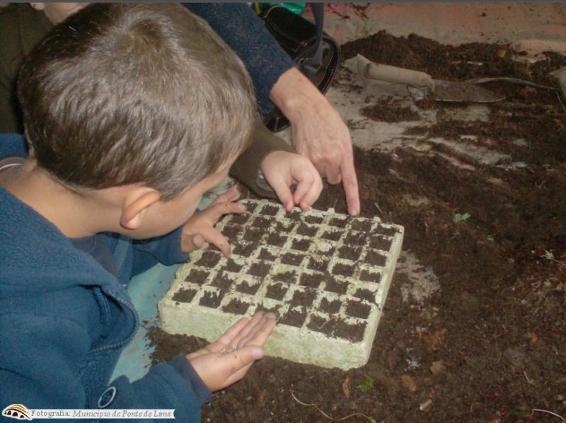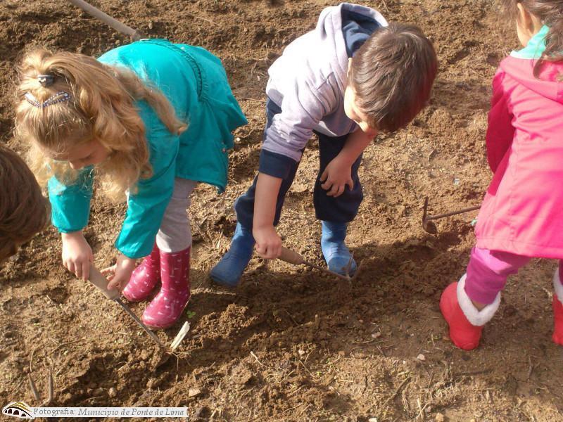 A todos os que nos visitaram foi-lhes atribuído um lote e entregue uma placa de madeira para identificarem o seu canteiro e o tema que irão trabalhar no decorrer deste ano letivo. A título de exemplo, uma turma delineou na terra um barco e colocou cebolinho no seu contorno. Este foi o desenho escolhido, uma vez que o tema de projeto da própria escola é o rio Lima.