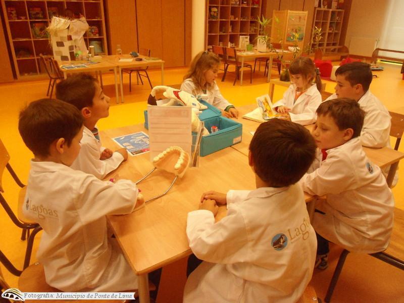 De seguida, as crianças exploraram a sala utilizando os microscópios e lupas, mexendo no modelo do corpo humano (montando e desmontado os diferentes órgãos), aprenderam um pouco mais sobre a higiene oral, brincaram com jogos didáticos de tabuleiro e no computador e tiveram algumas noções sobre a roda dos alimentos.