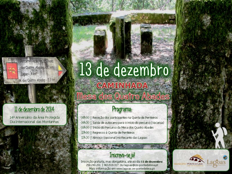 Dadas as condições climatéricas verificadas no passado dia 13 de dezembro, com o Instituto Português do Mar e da Atmosfera a lançar um alerta laranja para a nossa região, optou-se por anular a realização da Caminhada ao Percurso da Mesa dos Quatro Abades e adiar esta iniciativa para o próximo dia 31 de janeiro de 2015, enquadrada nas comemorações do Dia Mundial das Zonas Húmidas, a 02 de fevereiro.