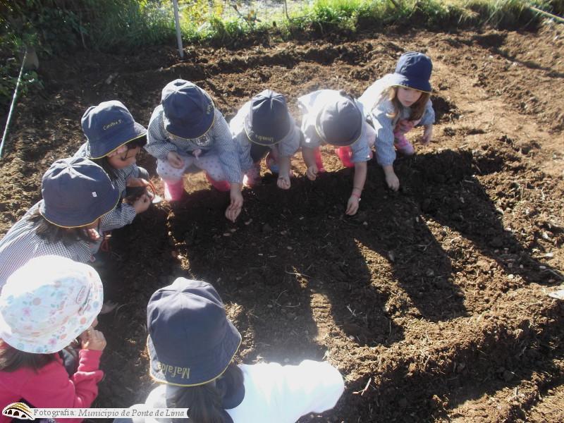 No final, equipados com sachinhos, passaram aos trabalhos de sementeira: favas, ervilhas, couve, cenoura, entre tantas outras, e de plantação: couve, salsa, etc.
