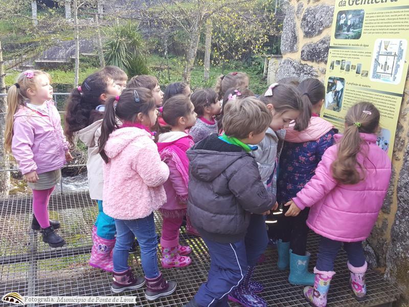 Depois de uma pequena caminhada pela Ecovia, as turmas participantes chegaram à zona dos moinhos, atraídas pelo som da água do ribeiro do Couto, onde ficaram a conhecer os moinhos movidos a água.
