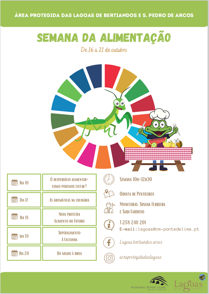 Neste sentido, entre os dias 16 a 20 de outubro celebra-se, na Área Protegida das Lagoas de Bertiandos e São Pedro de Arcos, nomeadamente, na Quinta Pedagógica de Pentieiros, a Semana de Alimentação, com um programa de atividades bastante diversificado, que irá ocorrer de segunda a sexta-feira, das 10h00 às 12h30.