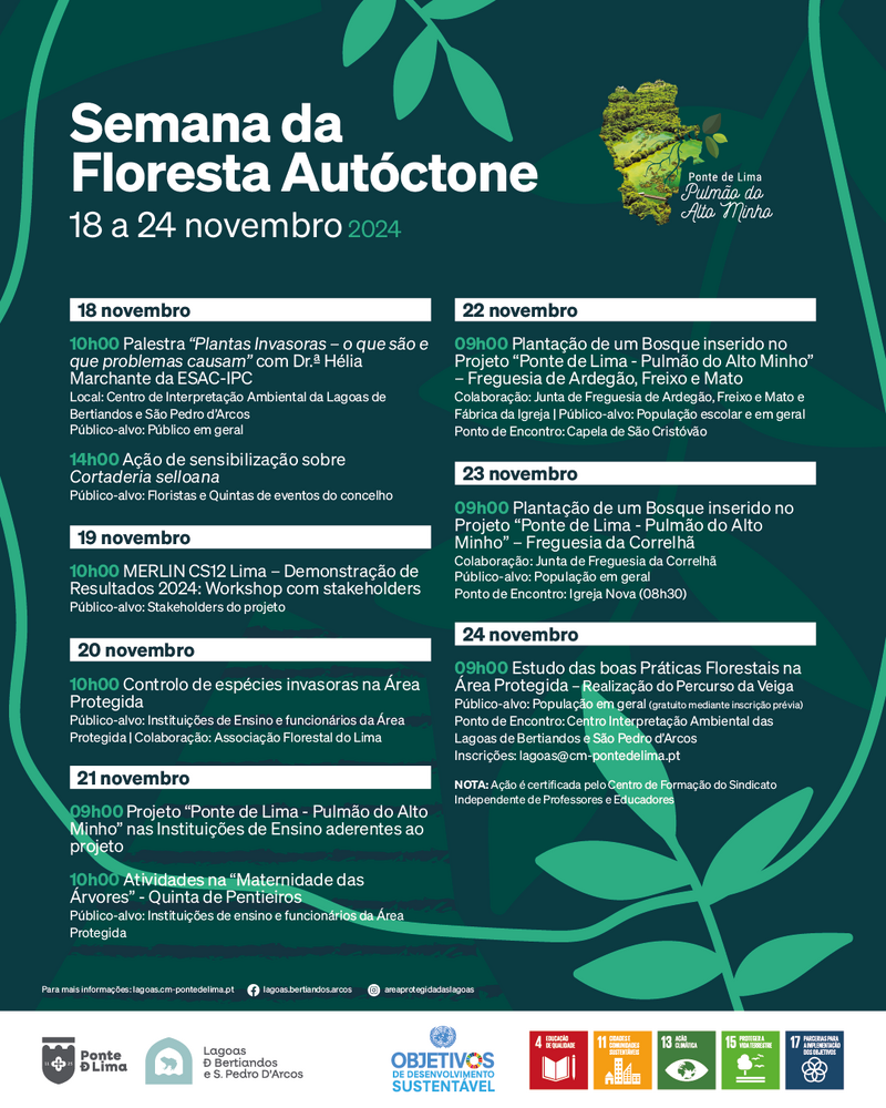 A Semana da Floresta Autóctone 2024, que decorrerá de 18 a 24 de novembro, terá início com a realização de uma palestra, no auditório do Centro de Interpretação Ambiental da Área de Paisagem Protegida das Lagoas de Bertiandos e São Pedro d’Arcos, com o tema “Plantas Invasoras - o que são e que problemas causam”. A palestra será ministrada pela Dra. Hélia Marchante, Professora na Escola Superior Agrária do Politécnico de Coimbra e investigadora no CERNAS (Research Centre for Natural Resources, Environment and Society). É também uma das responsáveis pela plataforma “Invasoras.pt” e desenvolve, desde 1997, investigação em plantas invasoras (ecologia, impactes, recuperação de ecossistemas e controlo biológico).
