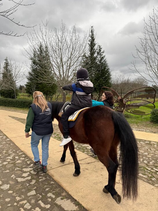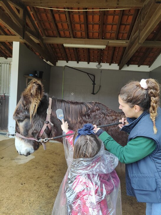 Enquanto decorria a Hipoterapia, os alunos tiveram oportunidade de fazer o maneio do Burro Egas, conhecer os póneis da Pony School e aprender sobre a alimentação dos equídeos. Realizaram ainda um pequeno passeio de charrete e volteio no picadeiro.