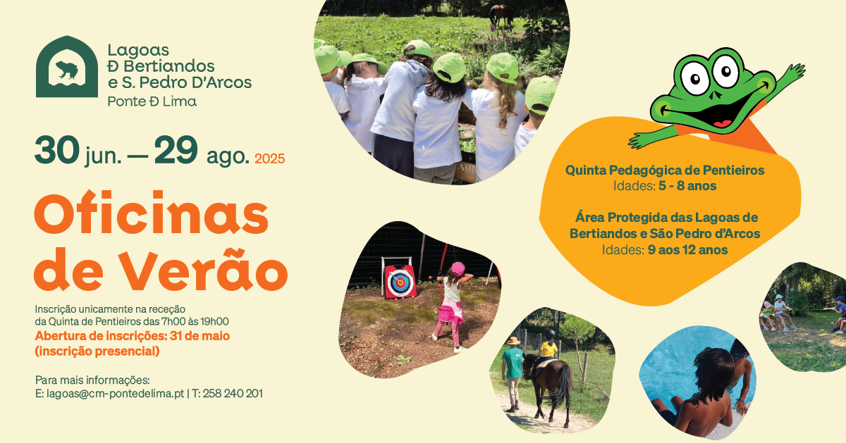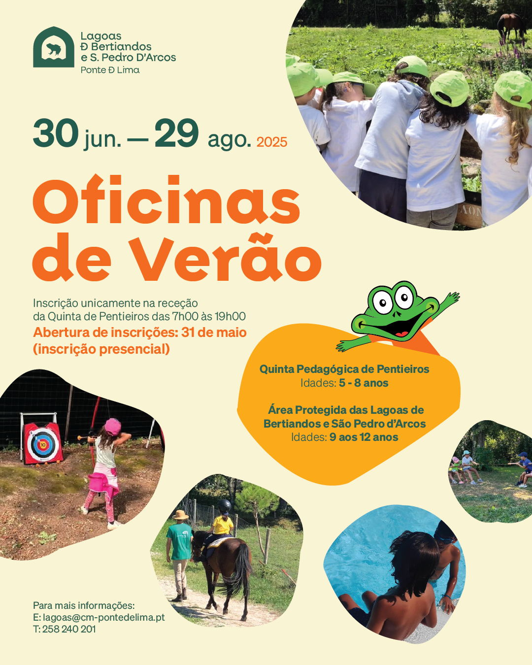 As férias de verão aproximam-se a passos largos! A animação e a aventura estão de regresso. O verão de 2025 será, mais uma vez, repleto de atividades na Quinta Pedagógica de Pentieiros e na Área de Paisagem Protegida Regional das Lagoas de Bertiandos e São Pedro d'Arcos.