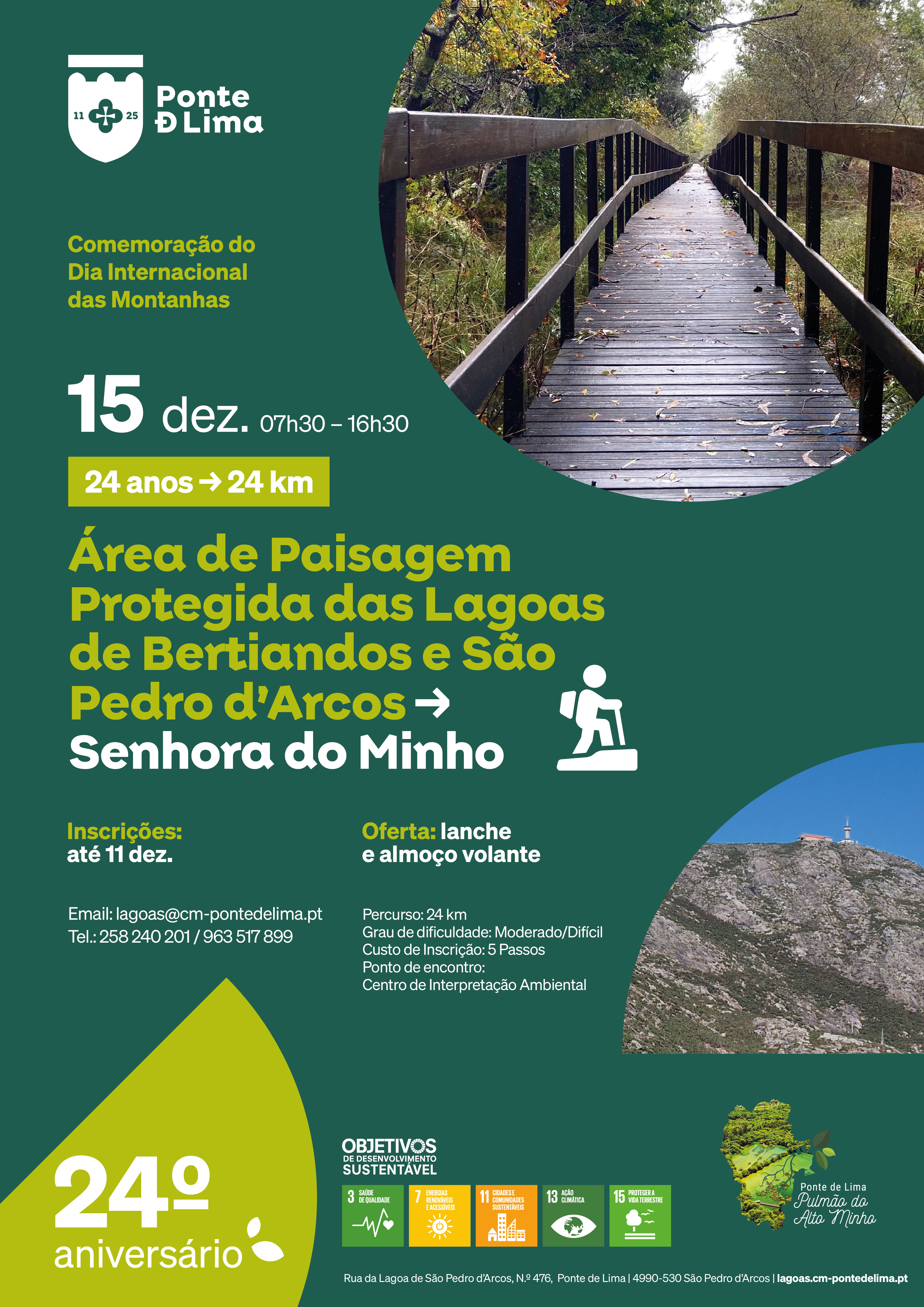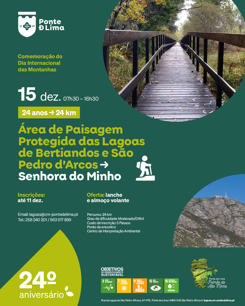 Para assinalar o 24.º Aniversário da Área de Paisagem Protegida Regional das Lagoas de Bertiandos e São Pedro d’Arcos, que coincide com o Dia Internacional das Montanhas, o Serviço Área Protegida vai promover, no próximo dia 15 de dezembro, a realização de um percurso pedestre, entre a Área Protegida das Lagoas e a Serra d’Arga, que se encontra também em fase de classificação, como Área Protegida.