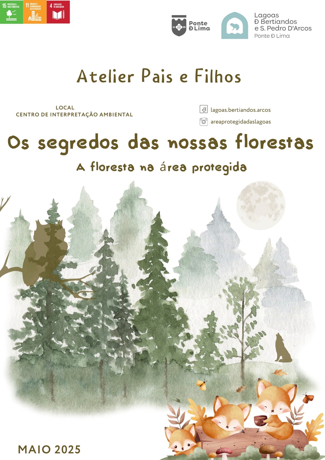 Durante o mês de maio, ao visitar o Centro de Interpretação Ambiental das Lagoas de Bertiandos e São Pedro d'Arcos, poderá participar no Atelier para Pais e Filhos: "Os segredos das nossas Florestas - A floresta na Área Protegida":