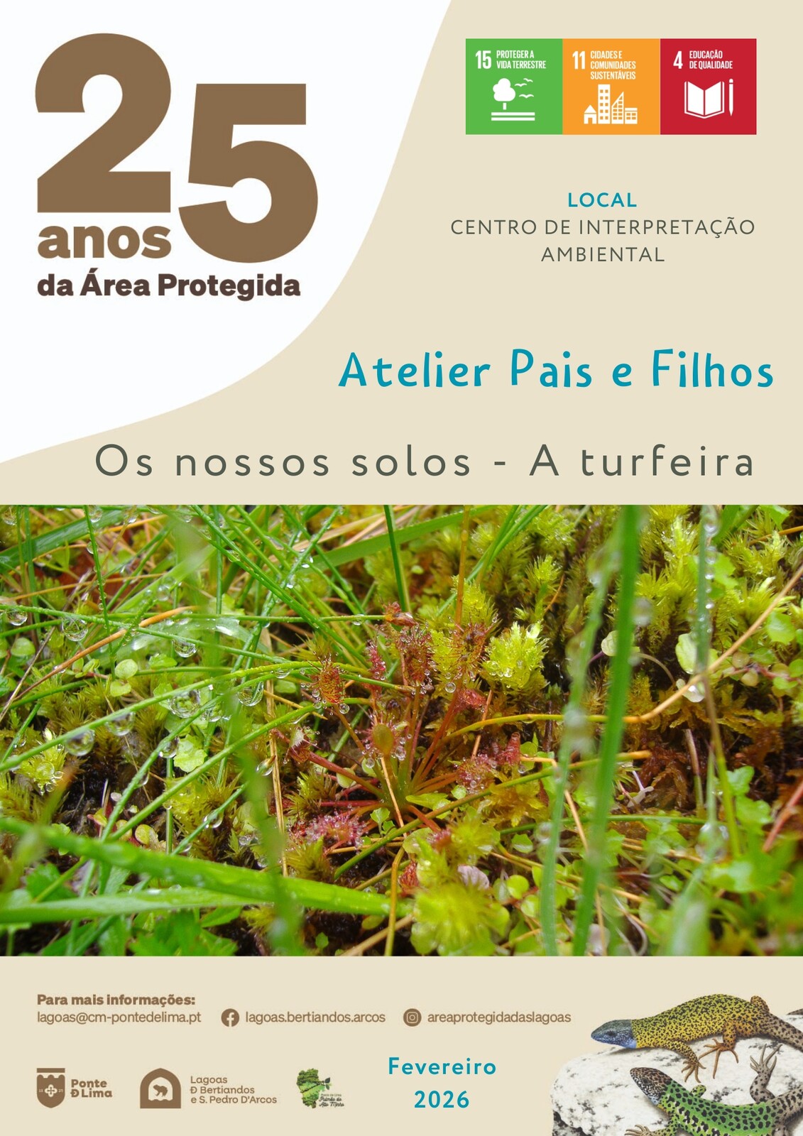 Durante o mês de fevereiro, ao visitar o Centro de Interpretação Ambiental das Lagoas de Bertiandos e São Pedro d'Arcos, poderá participar no Atelier para Pais e Filhos "Os nossos solos - a turfeira". Uma atividade para famílias, que convida a descobrir, experimentar e aprender, em contacto direto com a natureza.